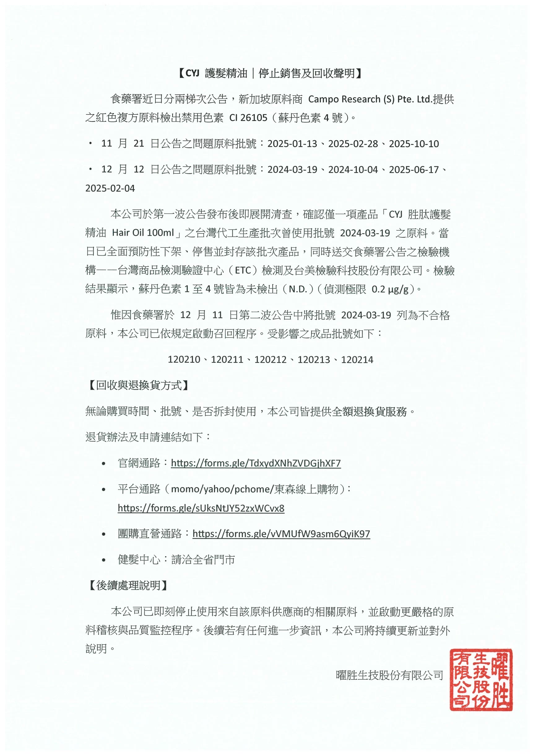 然而,因主管機關對供應商特定原料提出異常認定,基於 「安全優先」 的原則,DRCYJ 已於 2025/11/21 主動採取預防性下架措施。